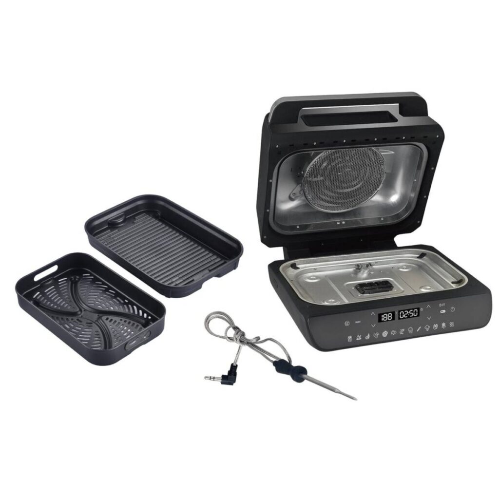 Το εύρος θερμοκρασίας από 45°C έως 230°C και ο χρονοδιακόπτης έως 60 λεπτά προσφέρουν πλήρη έλεγχο στη διαδικασία μαγειρέματος. Ο αισθητήρας θερμοκρασίας κρέατος εξασφαλίζει πάντα άψογα ψημένες μπριζόλες και κοτόπουλο.