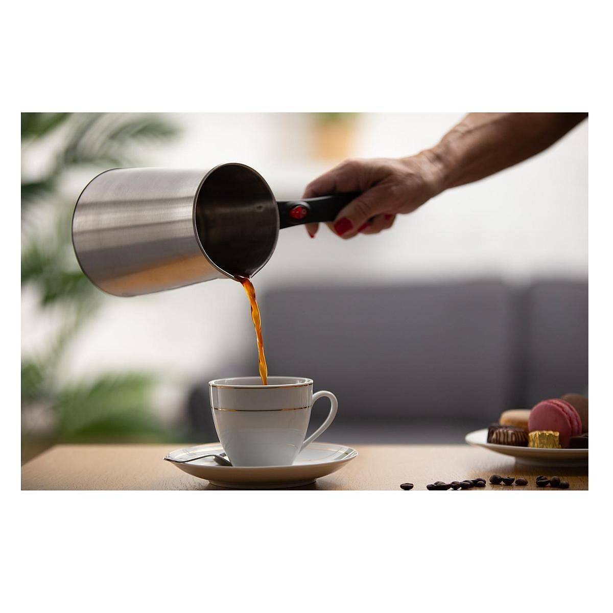 Η λειτουργία αυτόματης απενεργοποίησης εγγυάται ασφάλεια, αποτρέποντας την υπερθέρμανση και το βράσιμο του καφέ. Το ανοξείδωτο σώμα προσδίδει κομψή εμφάνιση και ανθεκτικότητα, ενώ η εργονομική λαβή εξασφαλίζει άνετο κράτημα και εύκολο σερβίρισμα.