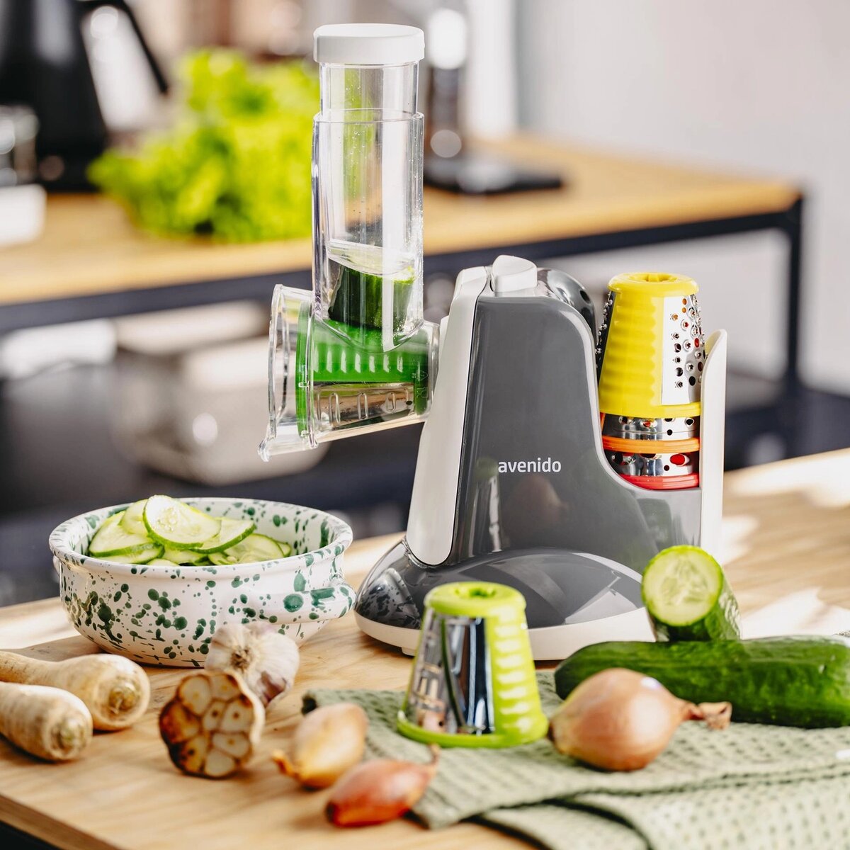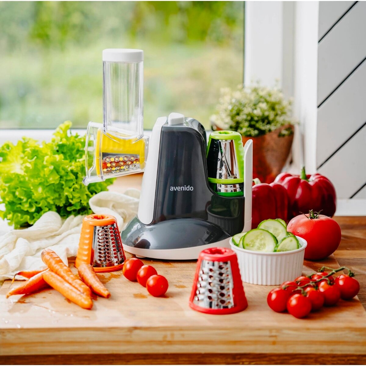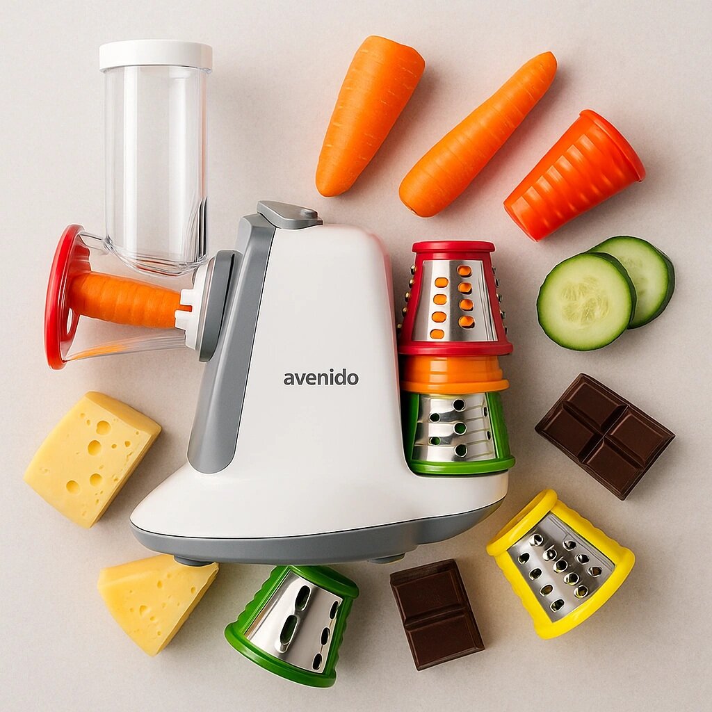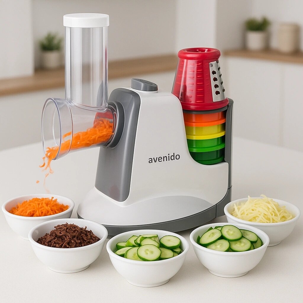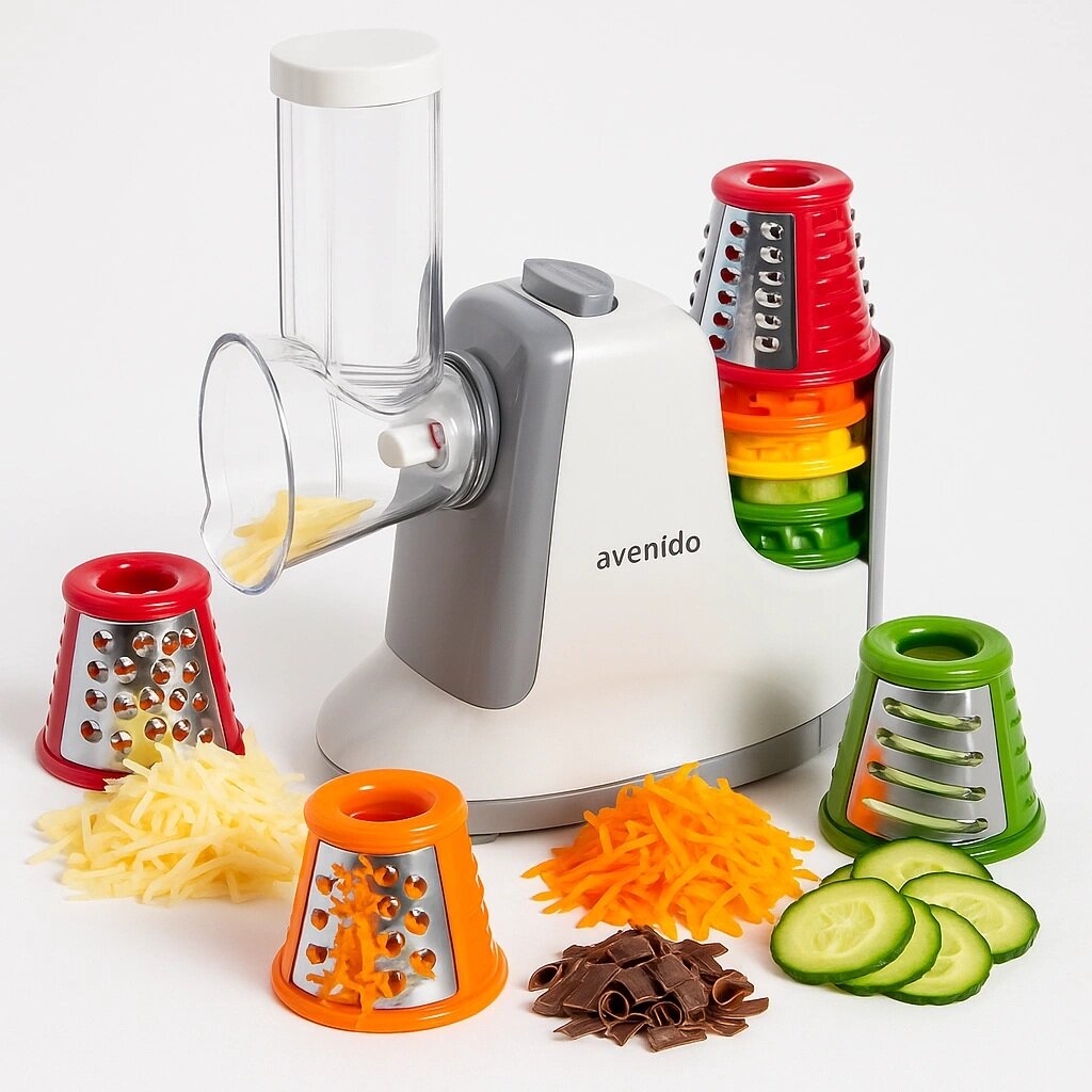 Ο ηλεκτρικός τρίφτης Avenido AV-4817 είναι μια πρακτική συσκευή κουζίνας που διευκολύνει σημαντικά την προετοιμασία των υλικών για το μαγείρεμα. Χάρη στα πέντε διαφορετικά εξαρτήματα, η συσκευή προσφέρει ποικιλία επιλογών για κόψιμο και τρίψιμο – από λεπτό τρίψιμο έως πιο χοντρές φέτες και πιο грубή επεξεργασία.