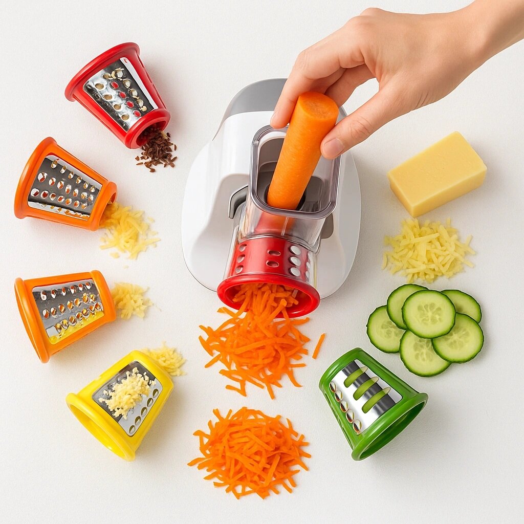 Η συσκευή διαθέτει εξαρτήματα για χοντρό τρίψιμο, λεπτό τρίψιμο, λεπτή κοπή, χοντρή κοπή και χοντρή άλεση, γεγονός που την καθιστά κατάλληλη για την προετοιμασία σαλατών, συνοδευτικών, για τρίψιμο τυριών ή για κόψιμο λαχανικών.
