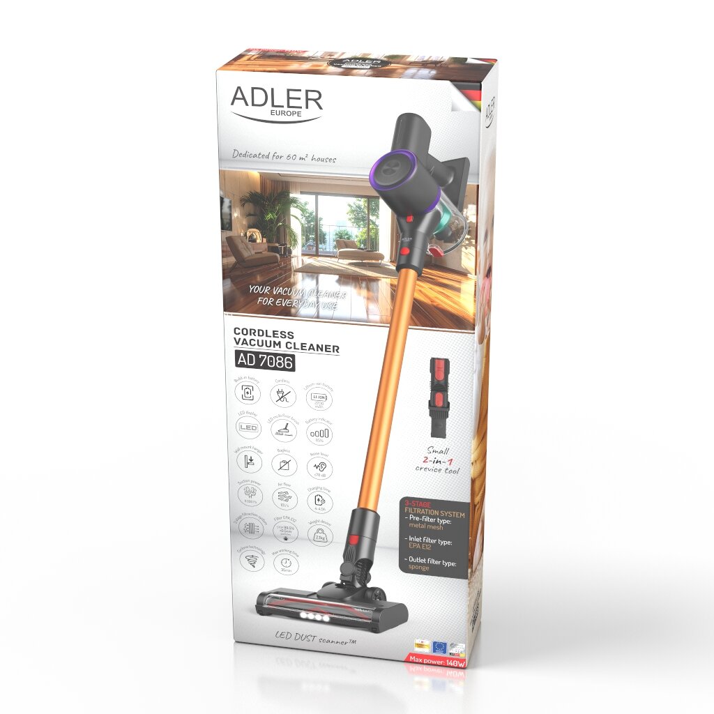 Κάθετη ηλεκτρική σκούπα Adler AD-7086, 140W, 0,6L, 3 βαθμίδες, οθόνη LED, HEPA H12, LED DUST SCANNER, Μαύρο/Χρυσό