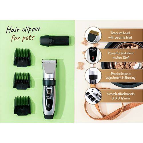 Το κατοικίδιό σας χρειάζεται κι αυτό ένα κούρεμα! Η επαγγελματική ηλεκτρική μηχανή κουρέματος κατοικιδίων Adler AD-2823 κάνει αυτή την αποστολή εύκολη και άνετη. Είναι κατάλληλη για κόκερ σπάνιελ, γιορκσάιρ, κανίς, περσικές γάτες και όλα τα ζώα με πλούσιο, μακρύ ή κοντό τρίχωμα. Σας επιτρέπει να κουρεύετε και να περιποιείστε με ακρίβεια το τρίχωμα του κατοικιδίου στο σπίτι, εύκολα και χωρίς πόνο.
