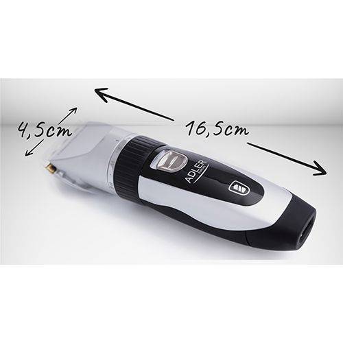 Η Adler AD-2823 μπορεί να χρησιμοποιηθεί τόσο ασύρματα μετά τη φόρτιση όσο και κατά τη διάρκεια της φόρτισης. Διαθέτει ισχυρό μοτέρ με χαμηλό θόρυβο και κεφαλή τιτανίου με κεραμική λεπίδα για ομαλή και αθόρυβη λειτουργία.