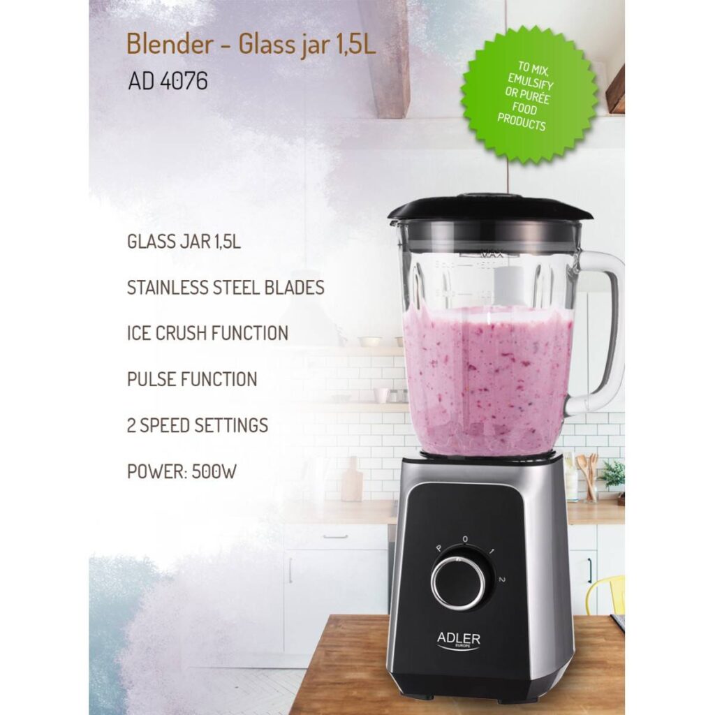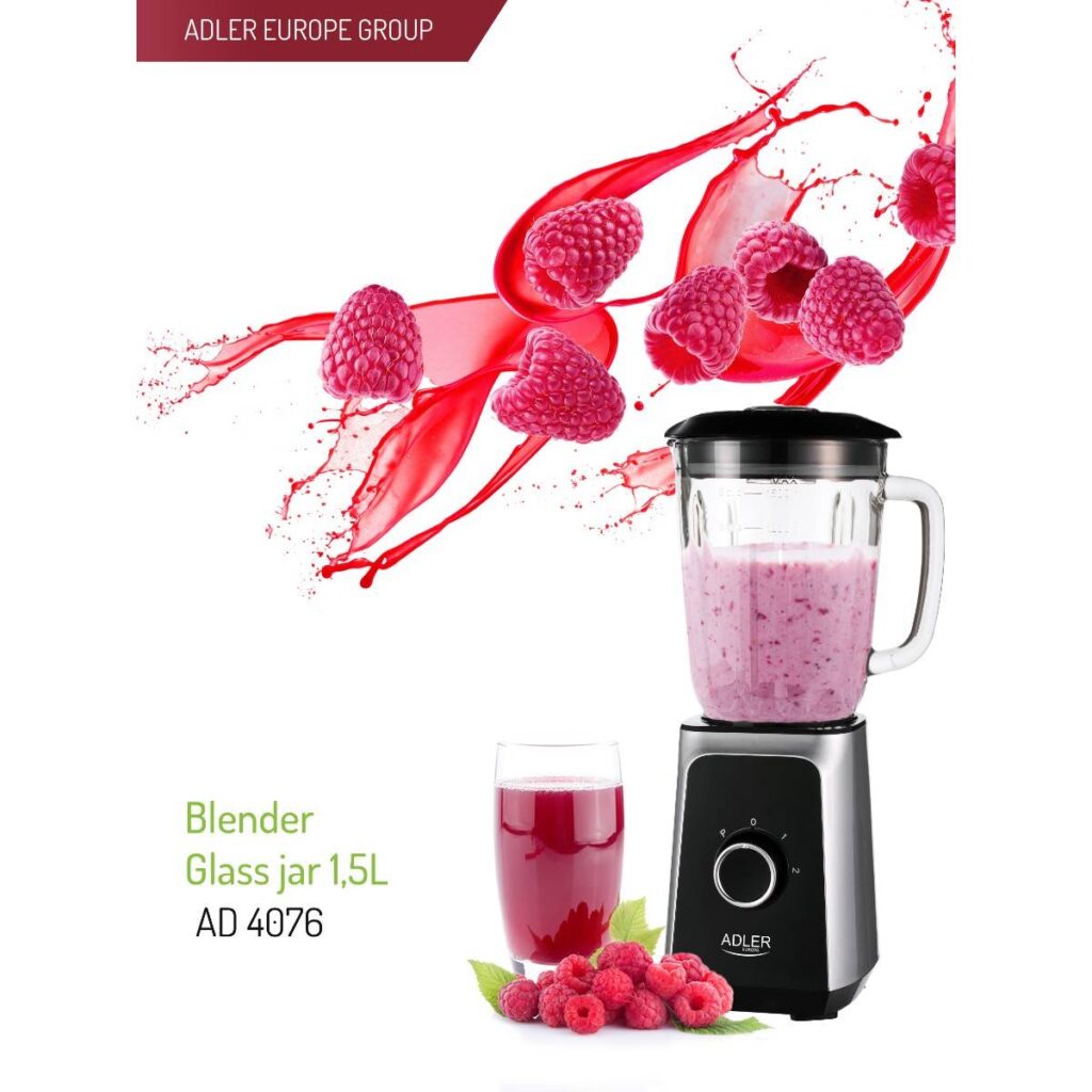 Μπλέντερ Adler AD 4076, 1000W, 1.5 λίτρα, Γυάλινη κανάτα, Ανοξείδωτο ατσάλι, 2 ταχύτητες, Pulse, Θρυμματισμός πάγου, Μαύρο
