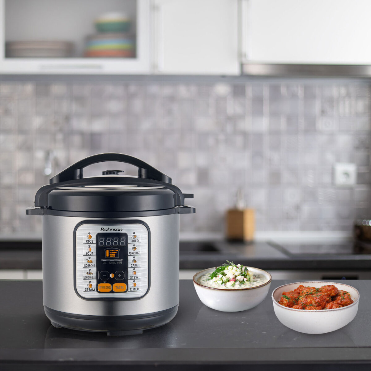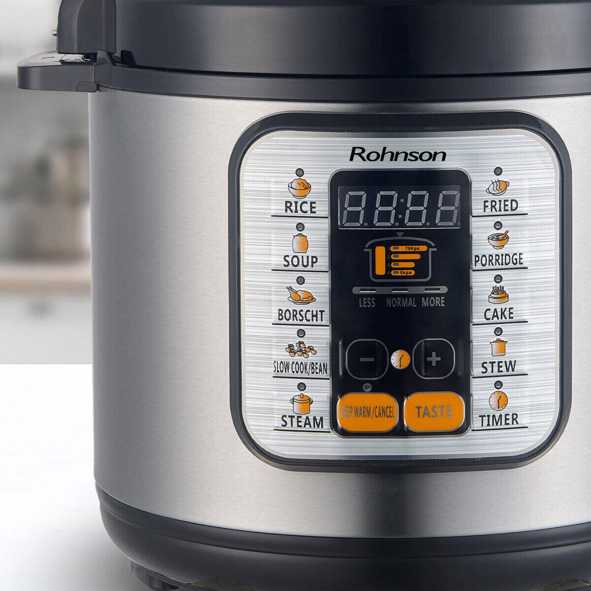 Το Rohnson R-2875 συνδυάζει το μαγείρεμα με πίεση με διάφορες αυτόματες λειτουργίες, όπως ρύζι, σούπα, μπορς, αργό μαγείρεμα/όσπρια, σοτάρισμα, τηγάνισμα, χυλό, επιδόρπιο και μαγείρεμα στον ατμό. Χάρη στη ρύθμιση του επιπέδου πίεσης, μπορείτε να προσαρμόζετε τη διαδικασία ανάλογα με τη συνταγή.
