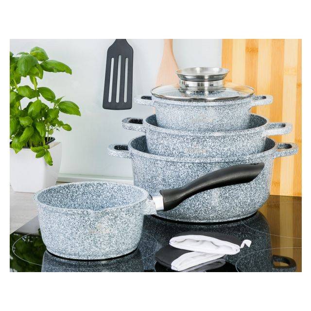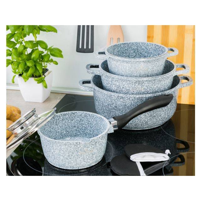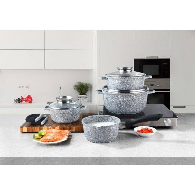 Τα σκεύη είναι κατασκευασμένα από υψηλής ποιότητας αλουμίνιο με ανθεκτική κεραμική και μαρμάρινη επίστρωση, ανθεκτική στη διάβρωση. Διαθέτουν φερρομαγνητική επαγωγική βάση που εξασφαλίζει ομοιόμορφη και γρήγορη κατανομή της θερμότητας. Κατάλληλα για όλους τους τύπους εστιών – αλογόνου, κεραμικές, αερίου και επαγωγικές. Η αντικολλητική μαρμάρινη επίστρωση υψηλής σκληρότητας δεν αντιδρά με τα τρόφιμα, δεν αλλοιώνει τη γεύση και αποτρέπει το κάψιμο. Επιτρέπει το μαγείρεμα με ελάχιστη ποσότητα λίπους – ιδανική επιλογή για διαβητικούς, άτομα σε δίαιτα και όσους φροντίζουν τη διατροφή τους.