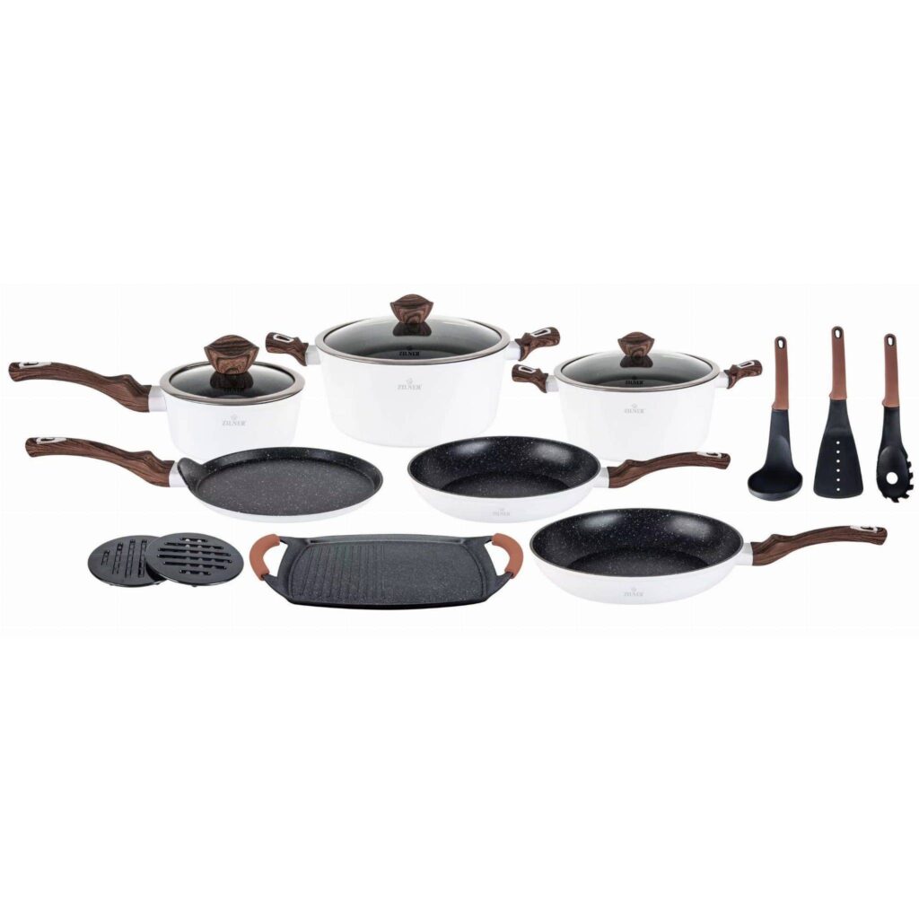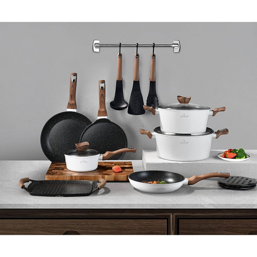 Σετ μαγειρικών 15 τεμαχίων με μαρμάρινη επίστρωση ZILNER ZL-8592, Κατάλληλο για επαγωγή, Χυτό αλουμίνιο, Λευκό/μαύρο