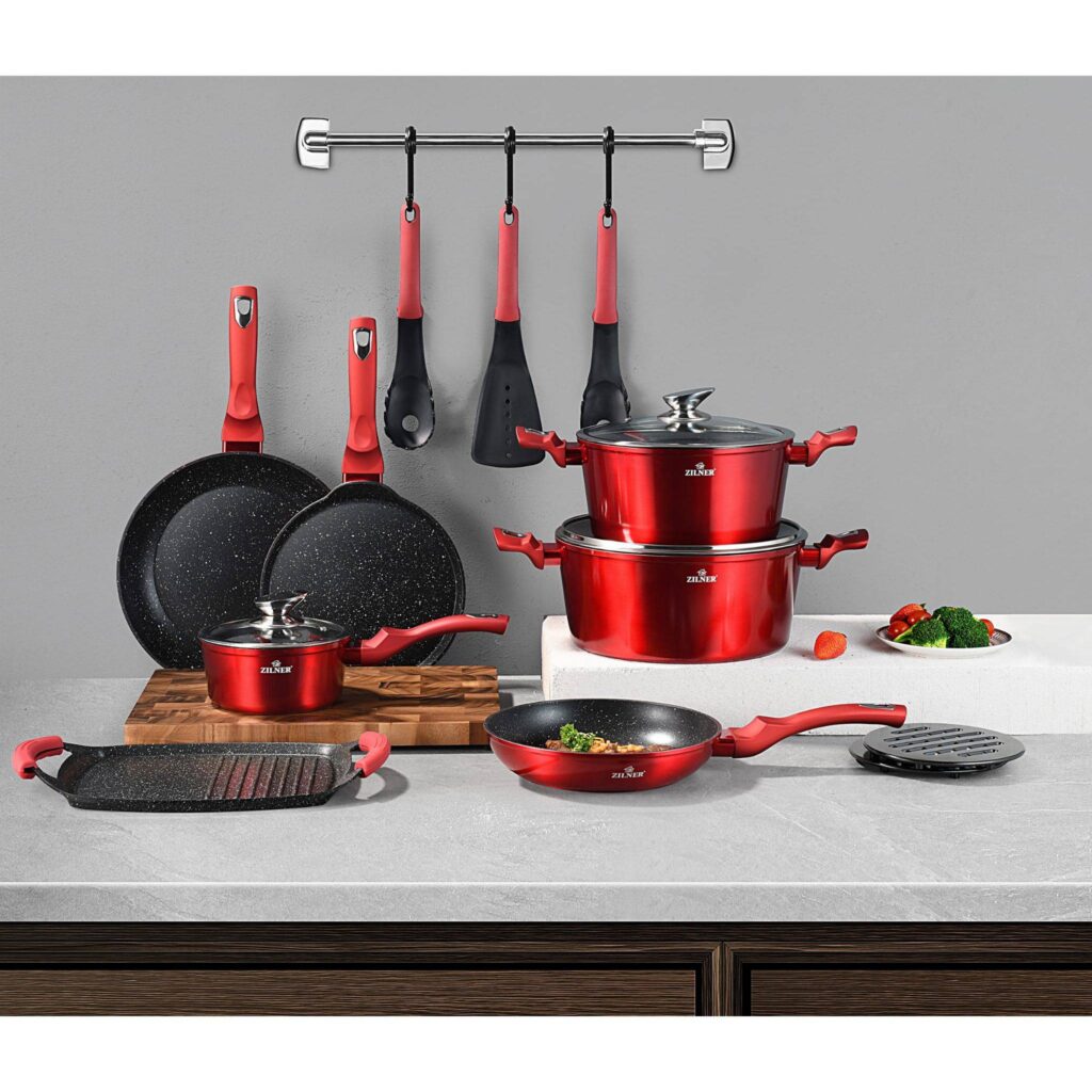 Το ZILNER ZL-8591 είναι ένα πολυτελές και μοντέρνο σετ μαγειρικών σκευών 15 τεμαχίων, που περιλαμβάνει τρεις κατσαρόλες με καπάκι διαφορετικής χωρητικότητας, δύο βαθιά τηγάνια, τηγάνι για κρέπες, μαντεμένια γκριλιέρα, δύο θερμοανθεκτικά σουπλά και βοηθητικά κουζινικά εργαλεία. Ενσωματώνεται εύκολα σε κάθε κουζίνα, συμπληρώνει ιδανικά την αισθητική της και προσθέτει χαρακτήρα.