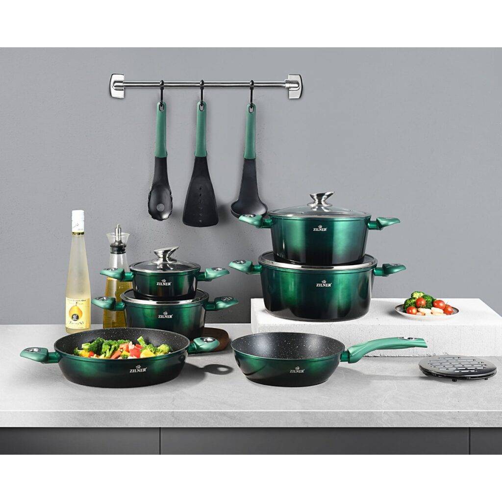 Σετ μαγειρικών σκευών 15 τεμαχίων Zilner ZL-8521, Μαρμάρινη επίστρωση, Χυτό αλουμίνιο, Επαγωγικές εστίες, Πράσινο