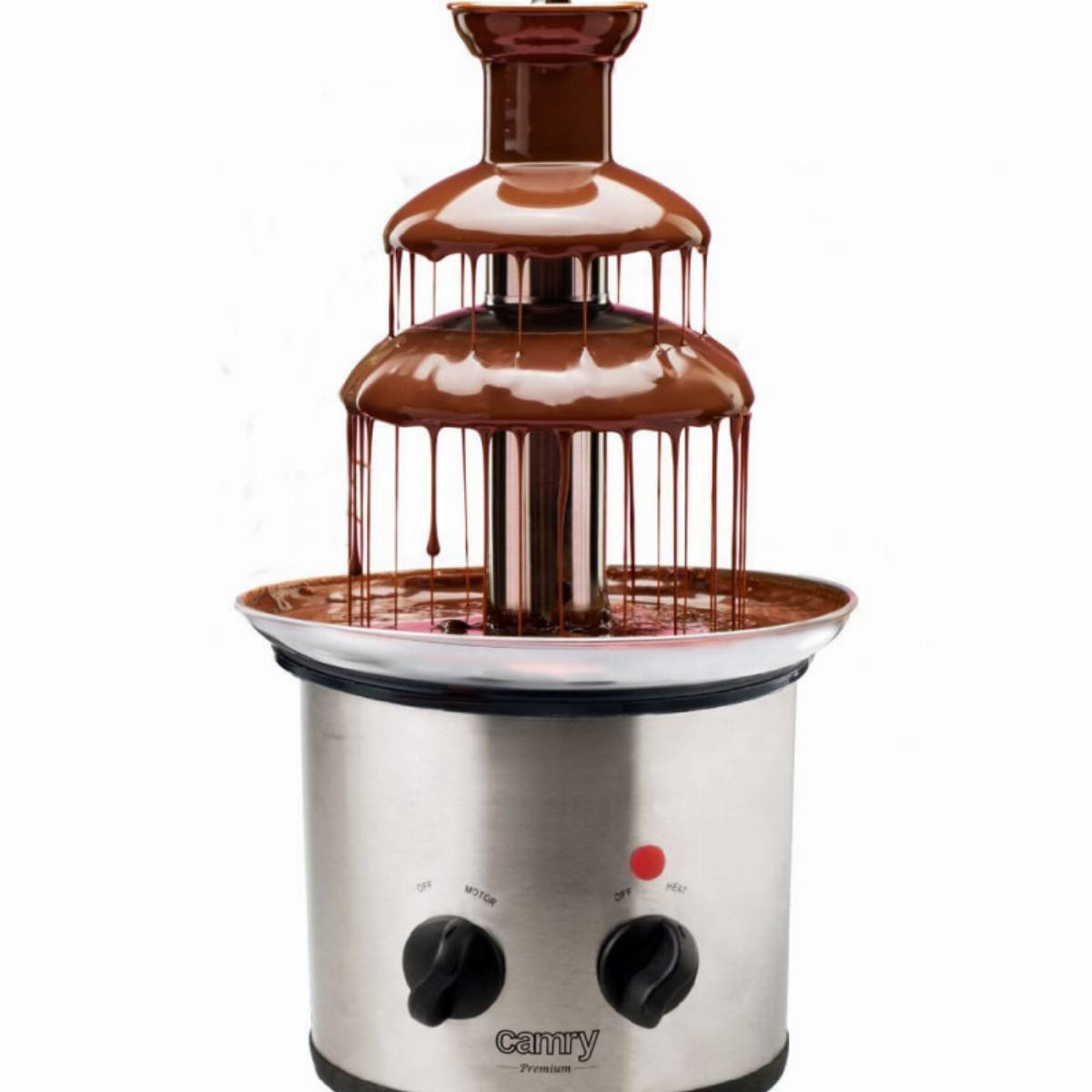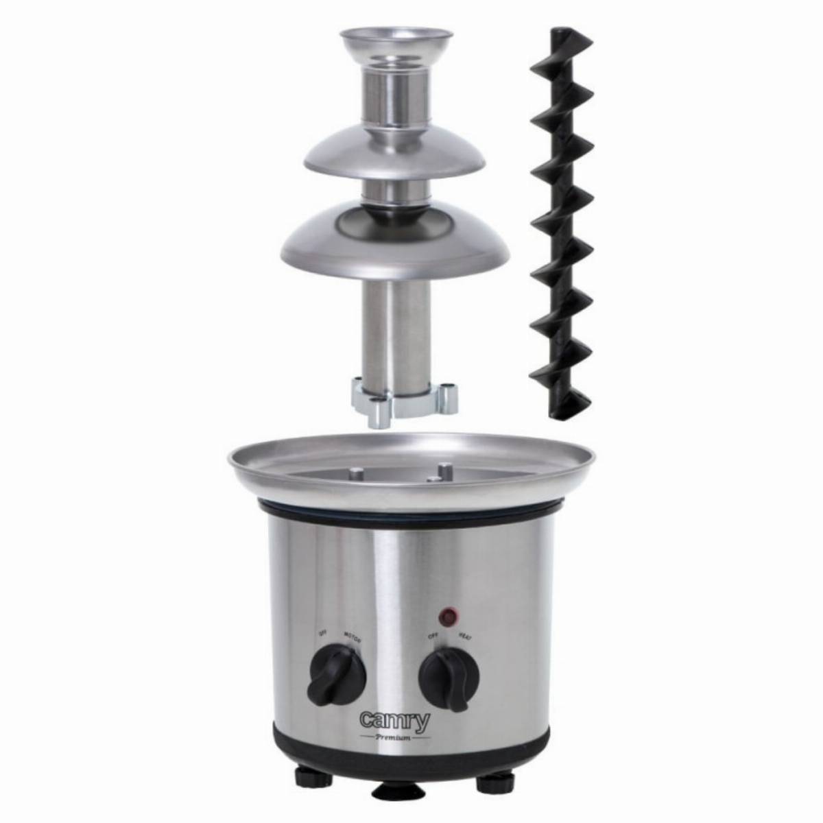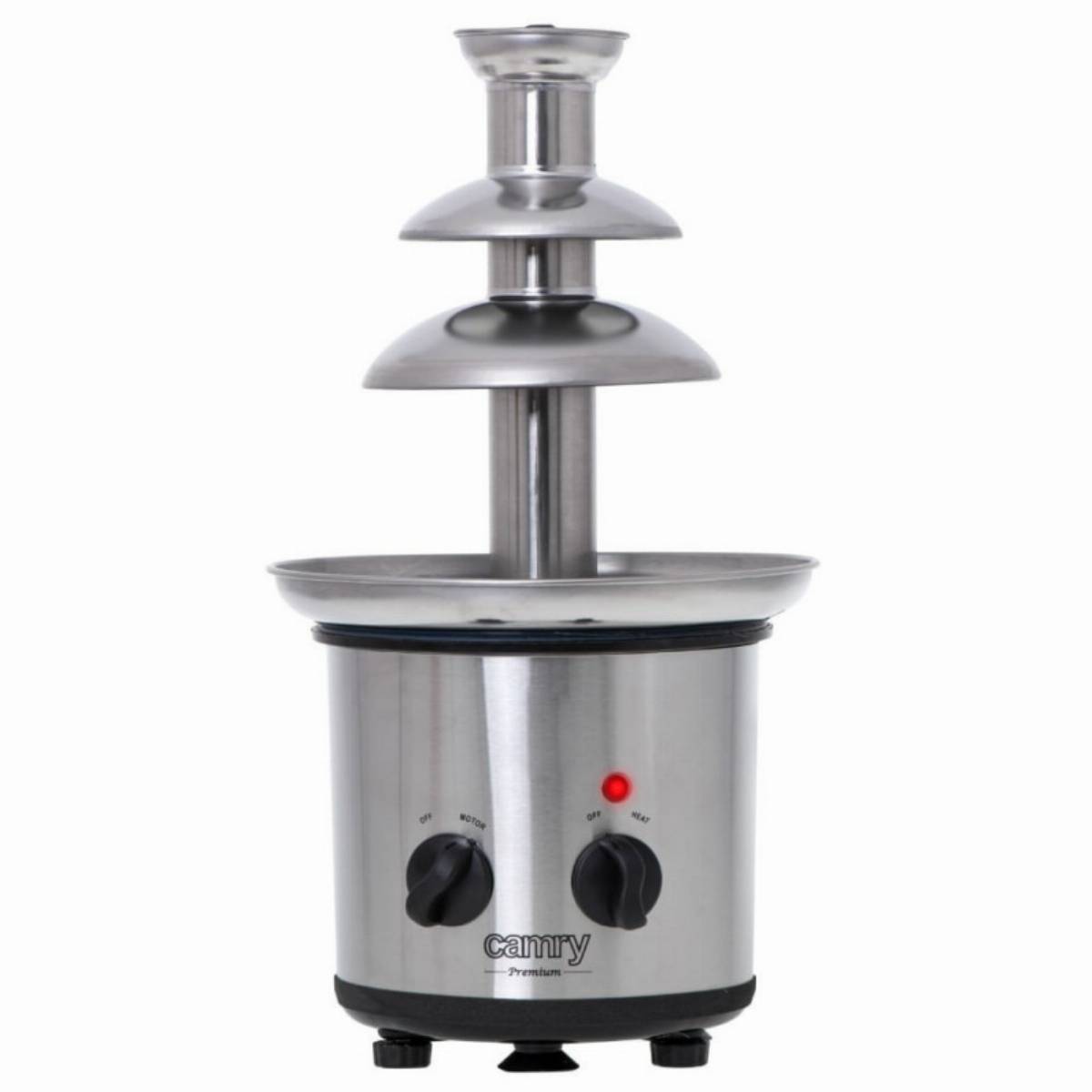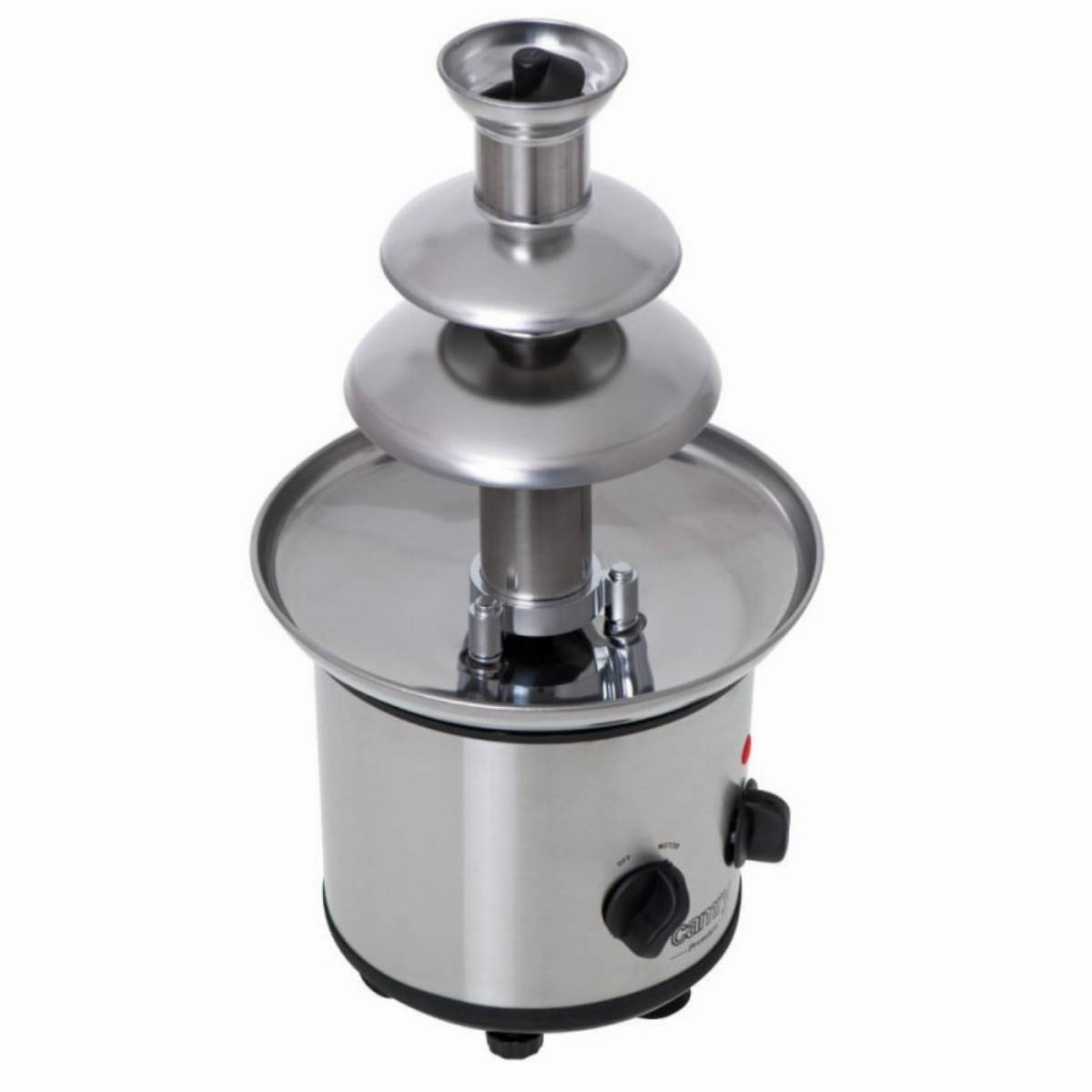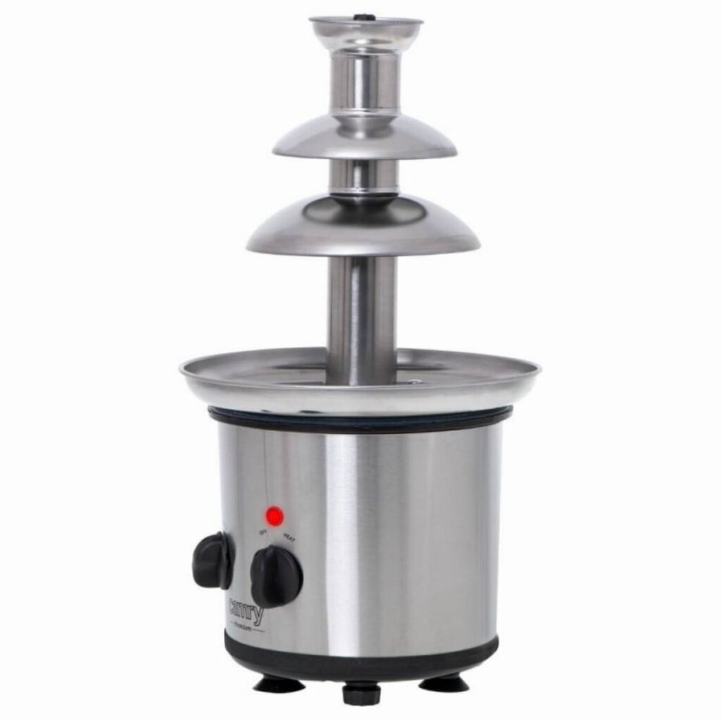 Το σιντριβάνι σοκολάτας Camry κάνει κάθε πάρτι πιο εντυπωσιακό. Μια δημοφιλής μορφή διασκέδασης με φαγητό σε γάμους και γενέθλια. Καθαρή απόλαυση να ετοιμάσετε το επιδόρπιο μόνοι σας. Μπορείτε να βυθίσετε τα αγαπημένα σας φρούτα όπως φράουλες, σταφύλια, κομμάτια μήλου ή ροδάκινου στη σοκολάτα. Η συσκευή είναι ιδανική και για διακόσμηση επιδορπίων με σοκολατένια επικάλυψη, καθώς μπορείτε επίσης να βυθίσετε χωνάκια παγωτού, βαφλάκια, μπισκότα ή σπιτικά γλυκίσματα σε λιωμένη σοκολάτα. Το σιντριβάνι σοκολάτας διαθέτει δύο κουμπιά για ενεργοποίηση της περιστροφής και της λειτουργίας θέρμανσης. Ο ευρύχωρος δίσκος με διάμετρο 21,4 εκ. χωρά 650 ml λιωμένη σοκολάτα.